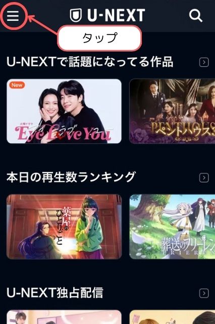 U-NEXT公式HPにアクセスし、左上のメニューアイコンをタップ。