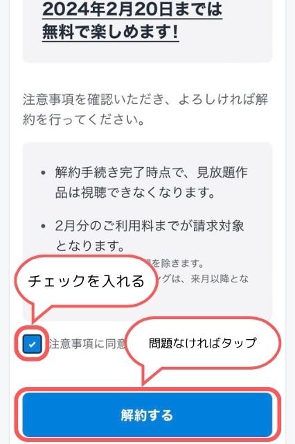 解約手続きのページに移動するので、注意事項をよく読んでください。